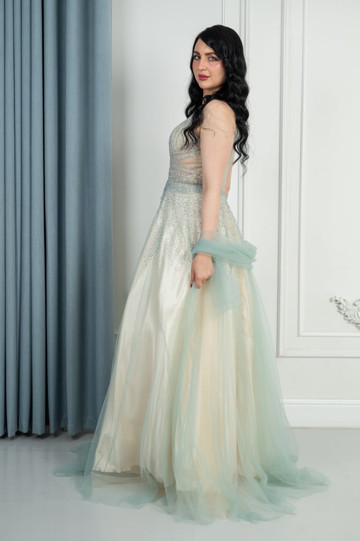 فستان سهرة طويل بيج وأخضر فاتح من التول والتطريز